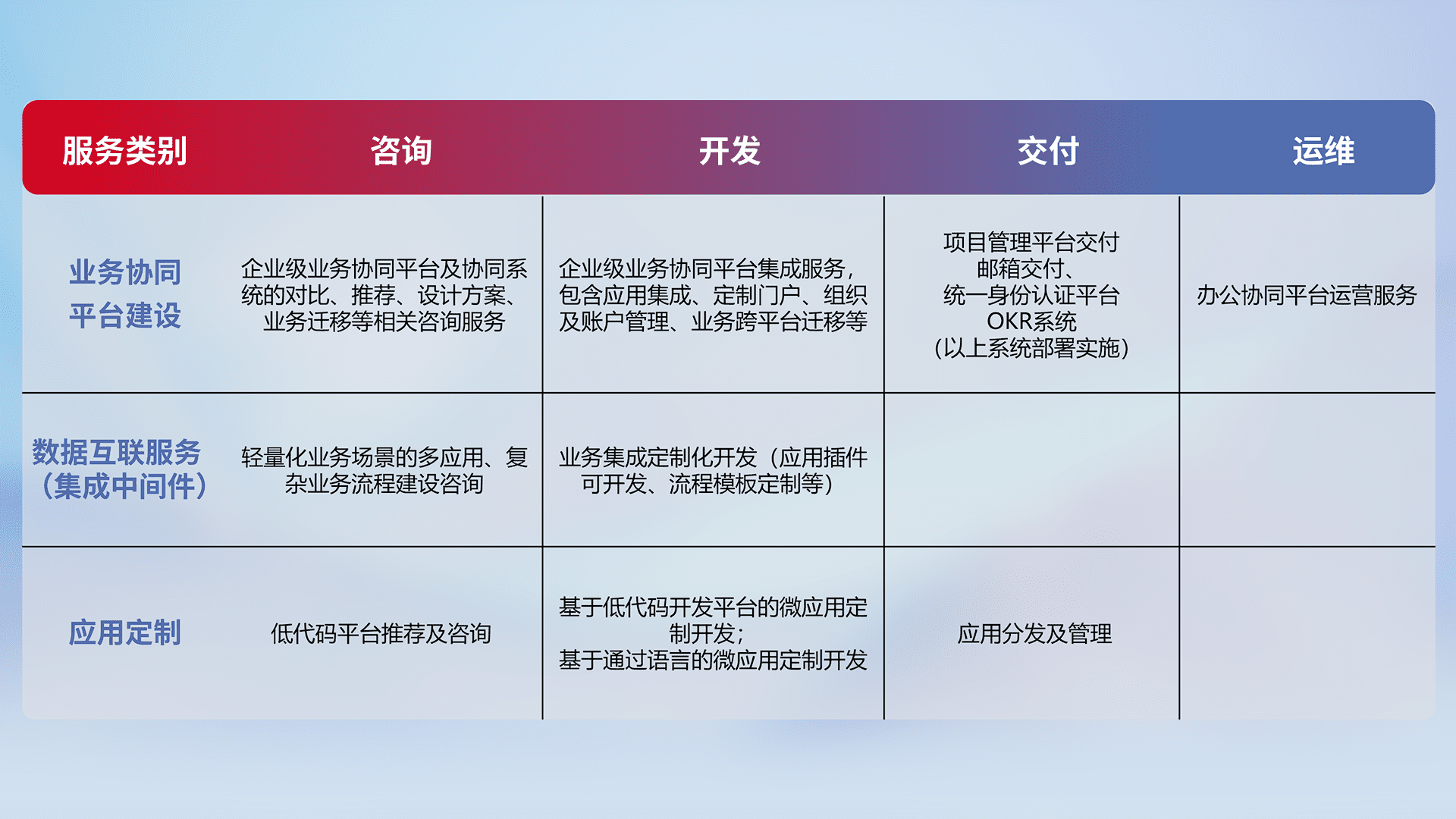 针对钉钉、、企微、、IDaas等平台级产品提供产品的规划、、、、方案、、、交付、、、、定制化开发等服务,,,,实现如统一协同办公、、、、智能客户服务、、混合会议管理、、、智能数据查询、、、等业务场景,,实现数字化转型。。